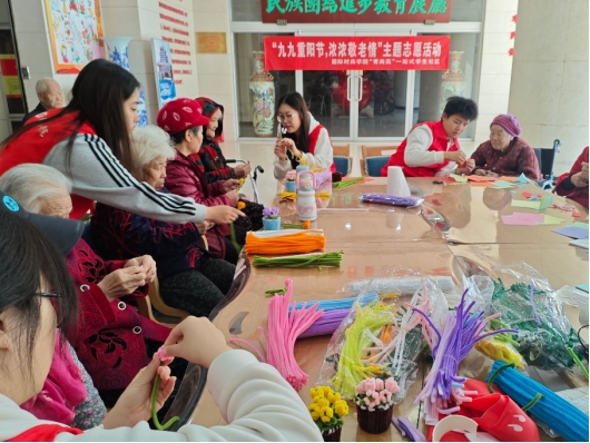 “这花做得真好看,摆在床头肯定特别亮眼!”一位奶奶捧着自己和学生共同完成的作品,脸上满是喜悦。制作间隙,志愿者们还陪老人们唠家常,为行动不便的老人捶背按摩。温暖的话语和贴心的举动,让老人们感受到如同家人般的关怀。活动尾声,学生们将提前准备的重阳节贺卡和水果礼盒送到老人们手中,送上节日的诚挚问候。
